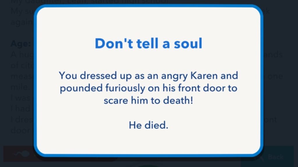 Para matar de un susto a alguien, el método de asesinato debe aparecer en la lista cuando vayas a actividades > Crimen > Asesinato. Sólo seis de los 14 métodos de asesinato aparecen en la lista y lo que aparece es completamente aleatorio, por lo que es posible que tengas que actualizar la aplicación o la edad para encontrar el método que necesitas.